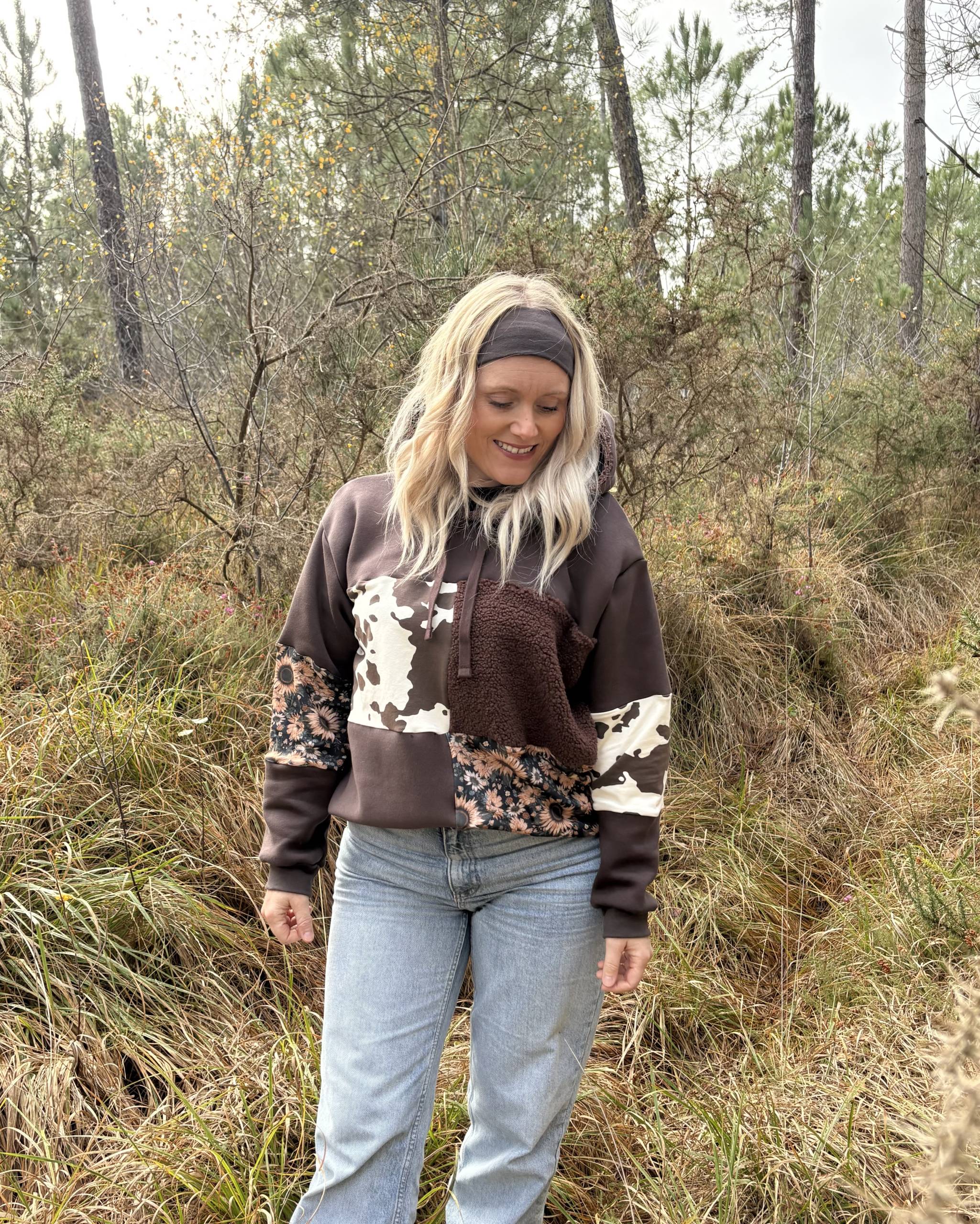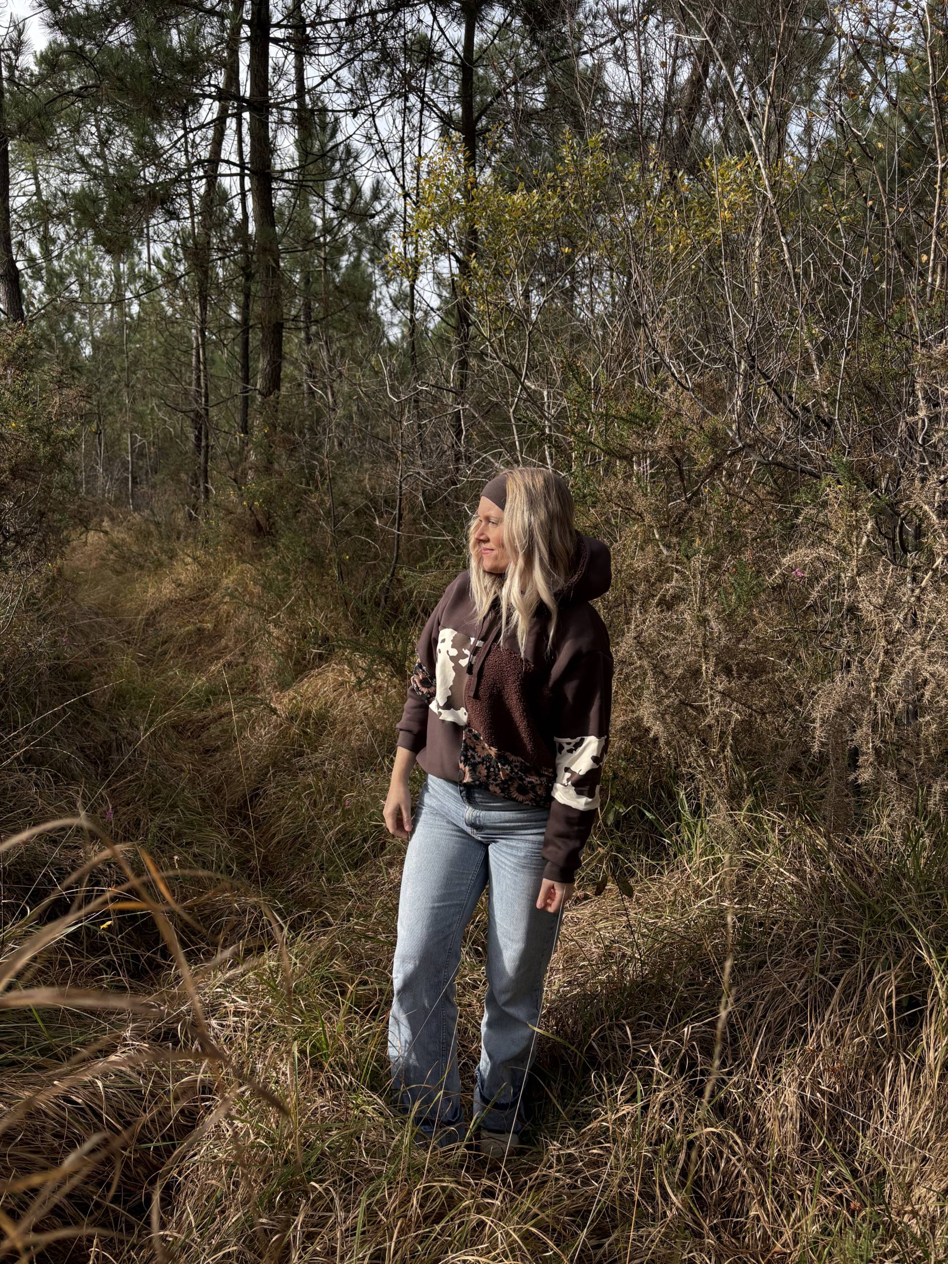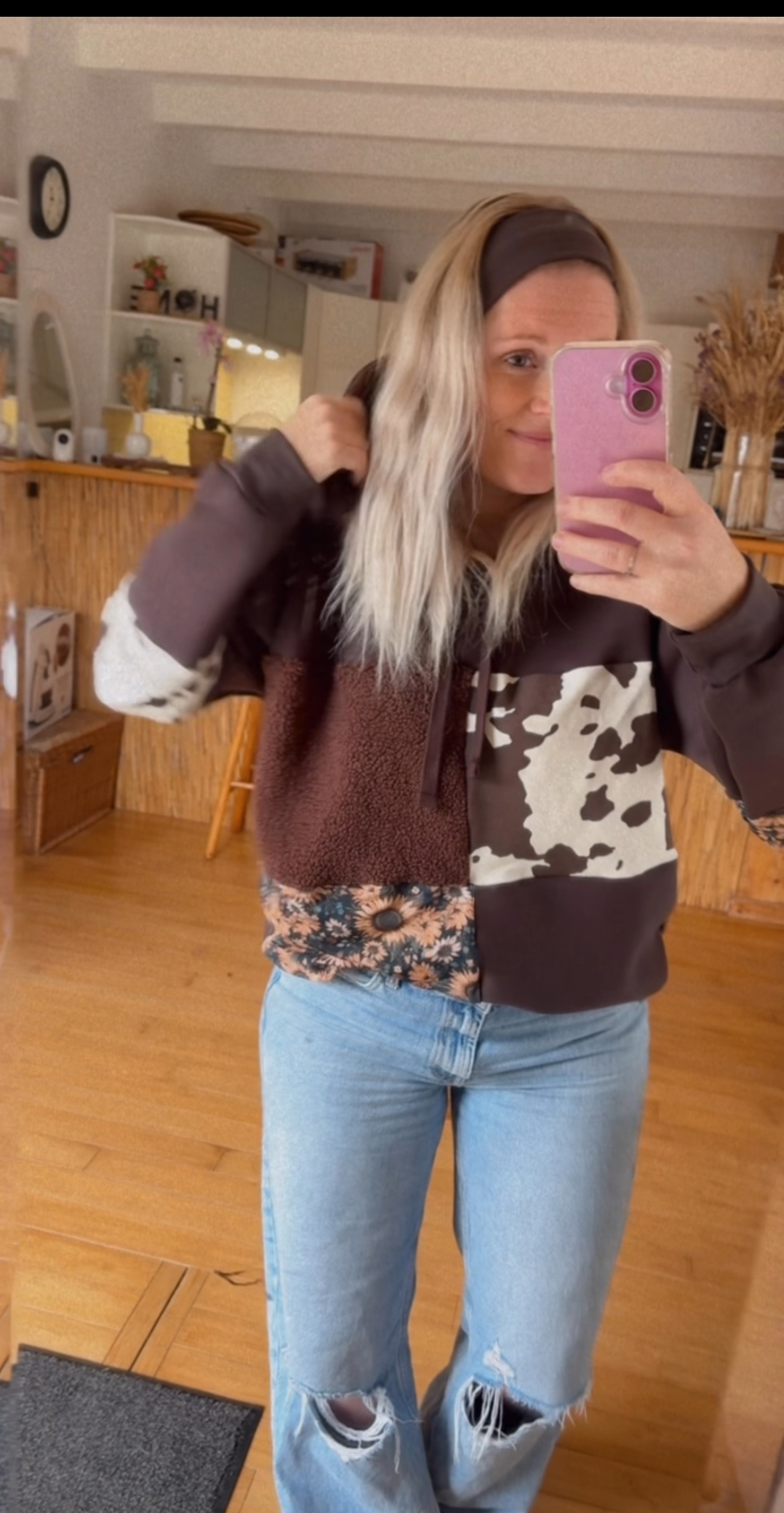 Mon petit crush c’est lui! Le sweat à capuche couleur chocolat avec 4 tissus dans les tons marrons style patchwork sur le devant et sur les manches également! Coup de coeur garanti!!